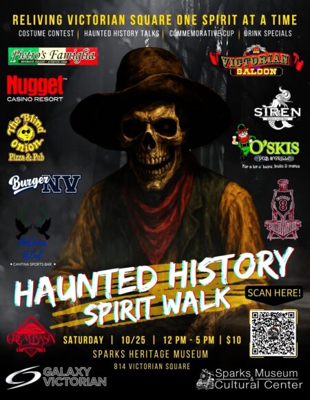 lessCenter 👻Relive Victorian Square one spirit at a time with ghostly tales, costume contests, themed drinks, and a commemorative Spirit Walk cup!🗓 Saturday, October 25, 2025🕑 12:00 PM – 5:00 PM📍 Sparks Heritage Museum – 814 Victorian Square🎟 $10 per person (includes cup + museum admission)✨ Event Highlights:• Haunted history talks at select stops• Costume contest with prizes for best looks• Drink specials & spooky bites at local favorites• Raffle prizes throughout the day• Collect stamps at each venue & join the Spirit Hunt 👀🍹 Participating Venues & Specials include:– The Blind Onion Pizza & Pub: Beer Special + Twisted Pumpkin Sticks– Pietro’s Famiglia: $10 Wine & Pasta Pairing– Great Basin Brewing Co.: TBD– O’skis Pub & Grille: $5 Beer Specials– The Victorian Saloon: $4 Oktoberfest Beer– Paloma Azul: $20 Beer Bucket (6) / BOGO Cocktails– Nugget Casino Resort: TBD– Burger NV: $10 Bloody Margarita– Siren Salon: $5 Hair Tinsel or Face Paint + Wine Samples– Galaxy Victorian Theatre: $5 Popcorn, $5 Drink, $5 Beer + Local Filmmaker Showcase– Engine 8 Urban Winery: $10 Oogie Boogie Slushy🎃 How to Win Raffle Prizes:✔ Enter the Costume Contest✔ Visit every participating venue (no purchase required)✔ Attend haunted history talks✔ Hunt down Sparks’ famous spirits like Last Chance Joe, Bertha Raffetto, John Sparks, Samuel Clemens, and Tina the Elephant 🐘All proceeds benefit the Sparks Heritage Museum, keeping the stories and spirits of our city alive.🎟 Get your tickets here: https://www.zeffy.com/en-US/ticketing/haunted-history-spirit-walkLet the spirits guide you—if you dare! 👻🍸🍺