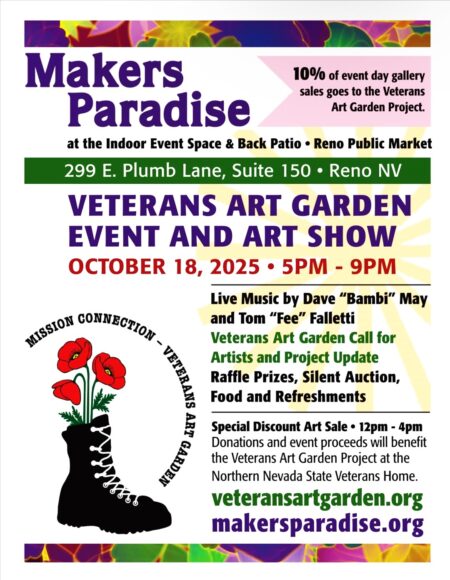 lessVETERANS ART GARDEN EVENT AND ART SHOW OCTOBER 18, 2025 • 5PM - 9PMAn Indoor Event & Back Patio • Reno Public Market299 E. Plumb Lane, Suite 150 • Reno NV10% of event day gallery sales goes to the Veterans Art Garden Project.Veterans Art Garden Call for Artists and Project UpdateRaffle Prizes, Silent Auction, Food and RefreshmentsSpecial Discount Art Sale • 12pm - 4pmDonations and event proceeds will benefit the Veterans Art Garden Project at the Northern Nevada State Veterans Home.