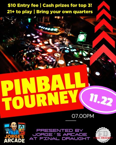Tournament, presented by Jorge’s Arcade.💰 $10 entry fee🏆 Cash prizes for the top 3 players🍻 21+ to play🎮 Bring your own quartersCome test your skills, enjoy a drink, and compete for bragging rights and cash prizes. 💰