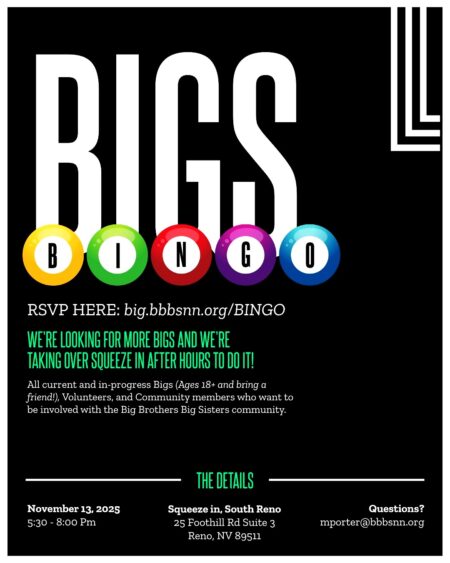 Send this to a friend who ... needs to stop talking about volunteering and actually become a Big!It’s time to put your money where your mouth is (just $5) for BINGO night at @squeezein. Join us for BINGO night with prizes (including a Broil King grill!), light appetizers, drinks, and networking with awesome people dedicated to #Mentorship.WHEN: Thursday, November 13, 2025 | 5:30 - 8:00 PMWHERE: Squeeze In | 25 Foothill Road, suite 3, RenoWHO: Current Bigs, volunteers, and anyone 18+ interested in learning more about Big Brothers Big Sisters! (If you bring a guest you get extra entries for door prizes!)Seats are limited! You MUST RSVP via the link in our bio to save your spot.