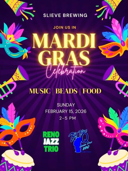 MARDI GRAS CELEBRATION 💚🎉💛Join us Sunday February 15th from 2-5pm for some Slieve style Bourbon Street fun!Enjoy delicious Cajun cuisine from Shane at @bigblueqoftahoe (you know he does it right) and listen to live New Orleans style jazz music from @therenojazztrio 🎺Bring your family and friends, we will provide the beads and booze 😜