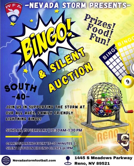 lessPMCome meet your Nevada Storm players, grab the 2026 game schedule, and score some Storm swag while supporting the team! 🌩️🎯 BINGO DETAILS🟡 Bingo cards: 1 for $2 | 6 for $10🟡 Each card is good for ONE round with TWO chances to win:• Regular bingo (vertical, horizontal, or diagonal)• Immediately followed by a blackout round🎲 Games start every 15–30 minutes🛍️ SILENT AUCTION• Bidding open from 10:30 AM – 1:00 PM• Awesome items up for grabs!👕 STORM SWAG• Merchandise available for purchase🍔 FOOD & DRINKS• Available for purchase through South 40✨ All ages | Family-friendly | Prizes • Food • FunStorm chasers, bring your friends and come support your team!