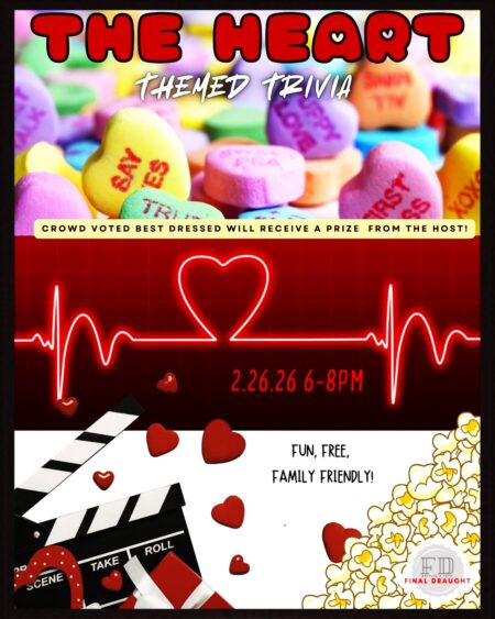 lessFebruary 26 from 6 to 8 PM, where the theme is all things heart, from the beating kind to love stories and everything in between. ❤️🍬Trivia is fun, free, and family friendly, so bring your team and come play. Costumes and themed outfits are encouraged, and the crowd will vote for best dressed, with the winner taking home a prize from the host.Come early, grab a drink, and let’s see who really knows their heart stuff. 🍻
