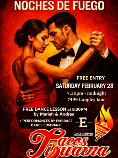 lessNOCHES DE FUEGO 🔥Dance. Learn. Feel the fire 💃🏽🔥🎟️ FREE ENTRY🕣 FREE Dance Lesson at 8:30PM with @andreaburkhart_ & @mar.rye.uhhh 🔥 Live Performances by @embracedancecompany 📅 Saturday, February 28⏰ 7:30PM – Midnight📍 7499 Longley Lane📍 Tacos Tijuana CantinaThis night is about to be 🔥🔥🔥