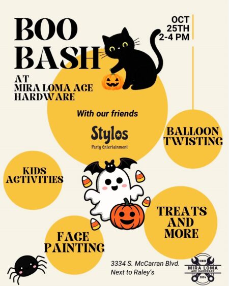 less🎃👻 Our BOO BASH is creeping closer! 👻🎃Mark your calendars for Saturday, October 25th from 2–4 PM at Mira Loma Ace Hardware (3334 S. McCarran Blvd., next to Raley’s)!We’ll have:🎨 Face Painting🎈 Balloon Animals🧒 Kids’ Activities🍬 Treats & MORE!!!It’s going to be a spook-tacular afternoon of family fun with our friends from Stylos Party Entertainment! Costumes encouraged — come ready for some frightfully fun memories!🗓️ Don’t forget to hit “Interested” or “Going” on our event page so you don’t miss out!