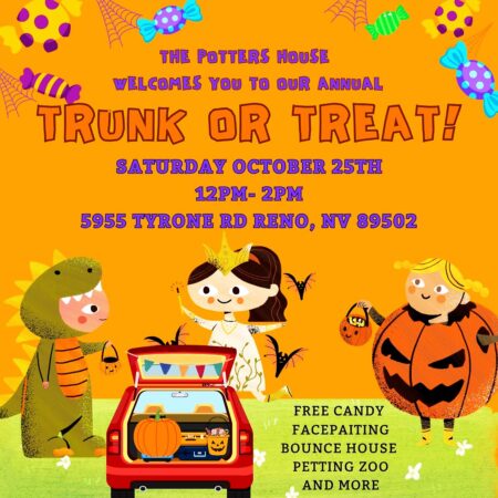 less🎉👻 Join Us for a Family-Friendly Trunk or Treat! 👻🎉We’re excited to invite you to our Trunk or Treat on Saturday, October 26th, from 12 PM to 3 PM at 5955 Tyrone Rd, Reno, NV, 89502! It’s a wonderful opportunity for our community to come together for some wholesome fun!🍬 Candy galore🎉 Games that’ll have you howling with laughter🎨 Creative face painting to transform your little ones🏰 A bouncy house for jumping joy🍰 A delicious cake walk for sweet prizes!🎭 Don’t forget to come in your best costume! We can’t wait to see the creativity our families will bring.This event is FREE, but we’d love to know if you’re coming! Click Going to let us know you’ll be there. RSVP is not mandatory, but it’s highly encouraged for planning treats and fun!Bring your family, friends, and lots of laughter as we celebrate together in a safe and joyful environment. We can’t wait to see you there! ✨