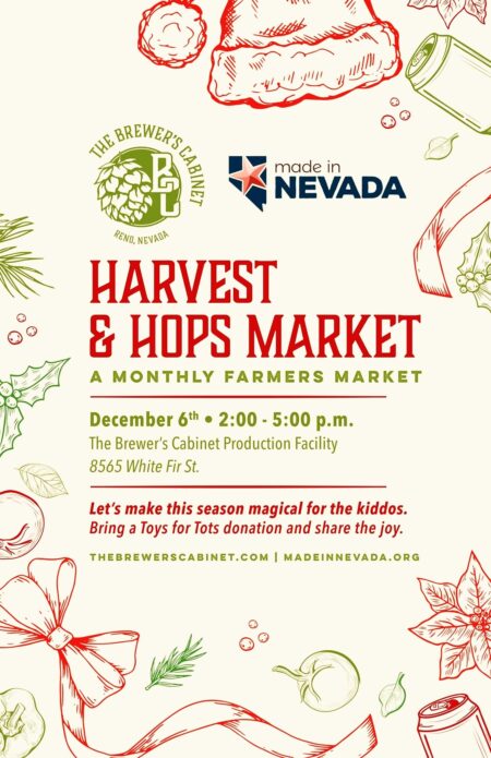 We're back at it again with Reno favorite @brewers_cabinet on Saturday, Dec. 6th for the Harvest & Hops Market - Holiday Edition! Join us from 2p - 5p for fine brews, locally made and grown goods perfect for holiday gifting, and fun activities for all ages!