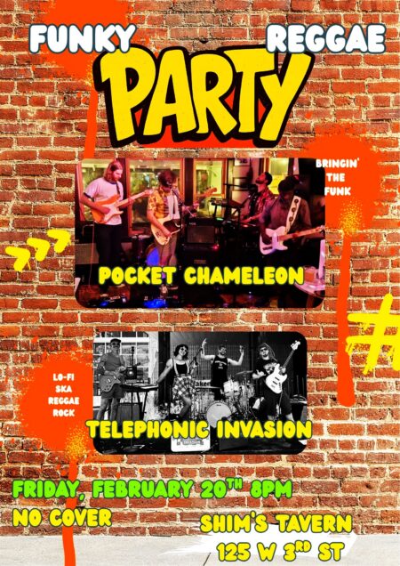 Come join us at Shim’s Tavern on Friday, February 20th! Show starts at 8pm. We’ll git ‘cha all nice and ready first with our feel-good ska/reggae/rock vibes, then you can enjoy some sexy funk from @pocket_chameleon ! Don’t miss this one!