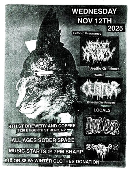 EY! NOVEMBER 12TH MORE GRINDCORE! ECTOPIC PREGNANCY AND QUITTER FROM THE PNW. AT 4TH ST BREWERY AND COFFEE. ALL AGES SOBER SPACE LEAVE IT IN THE CAR. $10 OR $8 WITH WINTER CLOTHES DONATION TO FAM SOUP. MUSIC AT 7PM SHARP ENDS AT 10. .