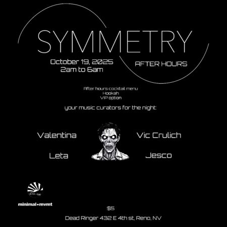 premier after-hours events, offering an unparalleled atmosphere and experience featuring deep house and techno. Enjoy our exclusive signature cocktail menu crafted specifically for Symmetry, and unwind in the back lounge with hookah. Additionally, indulge in specialty shots available every hour. Ask about the VIP package.Symmetry will take place on Sunday morning, October 19th, from 2:00 AM to 6:00 AM. The event will feature performances by: Jesco LetaValentinaVic Crulich21+ $5 Dead Ringer Analog Bar, Reno, NV