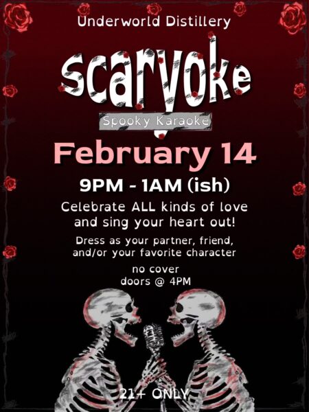 SCARYOKE: LOVE, BUT MAKE IT SPOOKYSaturday, February 14thValentine’s Day, but for everyone. Couples, besties, covens, situationships, and self-love icons welcome.Dress as your partner, your friend, or your favorite character and take the mic for a night of spooky, chaotic karaoke goodness. Love songs, breakup anthems, unhinged duets. Nothing is off limits.Doors at 4PMScaryoke from 9PM - 1AM (ish)No cover21+ onlyBecause love looks better after dark, and sounds slightly unhinged.