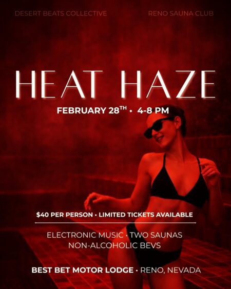 Heat Haze returns.Volume 2 lands February 28 from 4–8 PM inside the Sauna Club @renosaunaclub Electronic music, deep heat, and an intimate, immersive environment curated by Desert Beats.Tickets are officially live. Link in bio. Limited capacity.Bathing suits required.Bring a towel, water bottle, and robe.