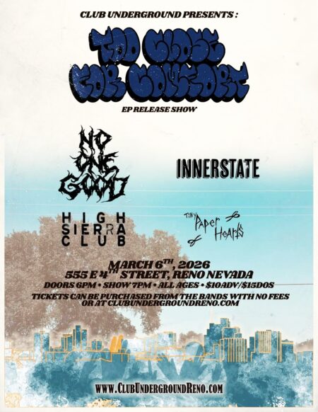 A chapter we’ve been writing for months finally hits the stage on March 6th with some of our best friends in @noonegoodnv @innerstateofficial @highsierraclub and @tinypaperhearts at the legendary @clubunderground.reno. Don’t miss this stacked local lineup for one night only. Tickets are $10 and are available through every band with no fees or online at clubundergroundreno.com