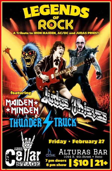 The Cellar Stage presents a tribute to the LEGENDS OF ROCK!This triple trouble testimonial highlights the best of JUDAS PRIEST, AC/DC and IRON MAIDEN. Featuring Judas Thieves, Thunderstruck and Maiden Minden.Exercise your necks and get those horns ready...Some heads are gonna roll, so be a Trooper, come out and get shook all night long.