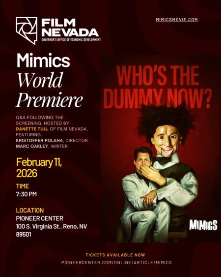 lessa genre-blending horror-romantic comedy starring Reno native Kristoffer Polaha in his directorial debut, written by Reno native Marc Oakley, and featuring a dynamic ensemble cast.Mimics follows Sam Reinhold (Polaha), a down-on-his-luck impressionist desperate for a break. When he strikes a deal with Fergus—a sinister, strings-attached puppet—success suddenly feels within reach, but at a terrifying cost that threatens the people he loves.🎤 Post-film Q&A with Kristoffer Polaha, Stephen Tobolowsky, MŌRIAH, Austin Basis, producer Ken Carpenter & Marc Oakley🎙 Moderated by Danette TullDon’t miss the opportunity to celebrate a film rooted and filmed in Northern Nevada’s creative spirit and hear directly from the filmmakers after the screening.