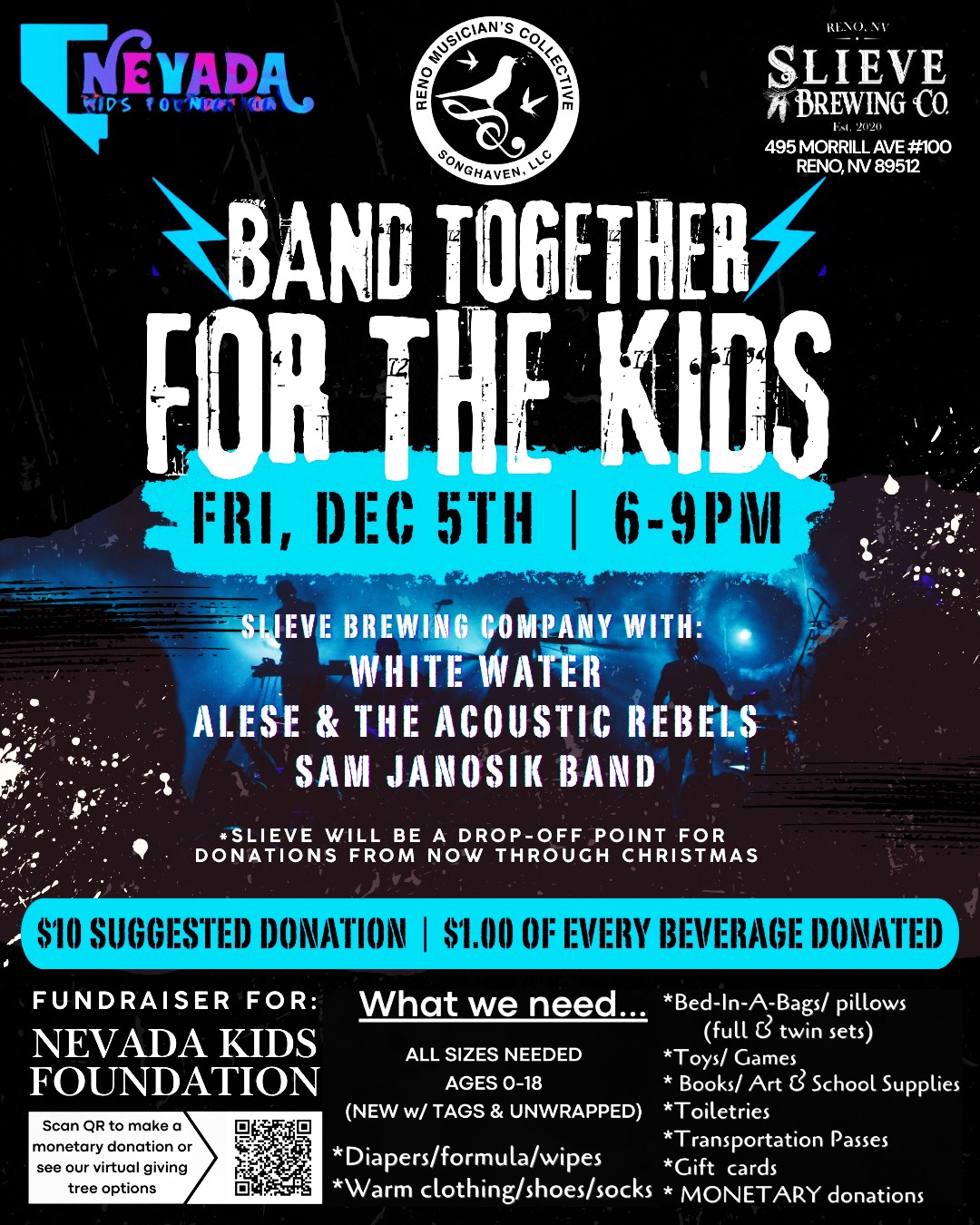 I have a big favor to ask. Will you help me spread the word about this event by spreading the word? On December 5th from 6-9pm at Slieve Brewing Company, we will be raising money for the Nevada Kids Foundation, INC. with three awesome bands: White Water, Alese & the Acoustic Rebels, and Sam Janosik Band. We are only asking for a $10 donation to attend (or bring an item listed at the bottom of the promo). Come out and help our local community this season – this non-profit is LOCAL and led by some amazing powerhouse women.