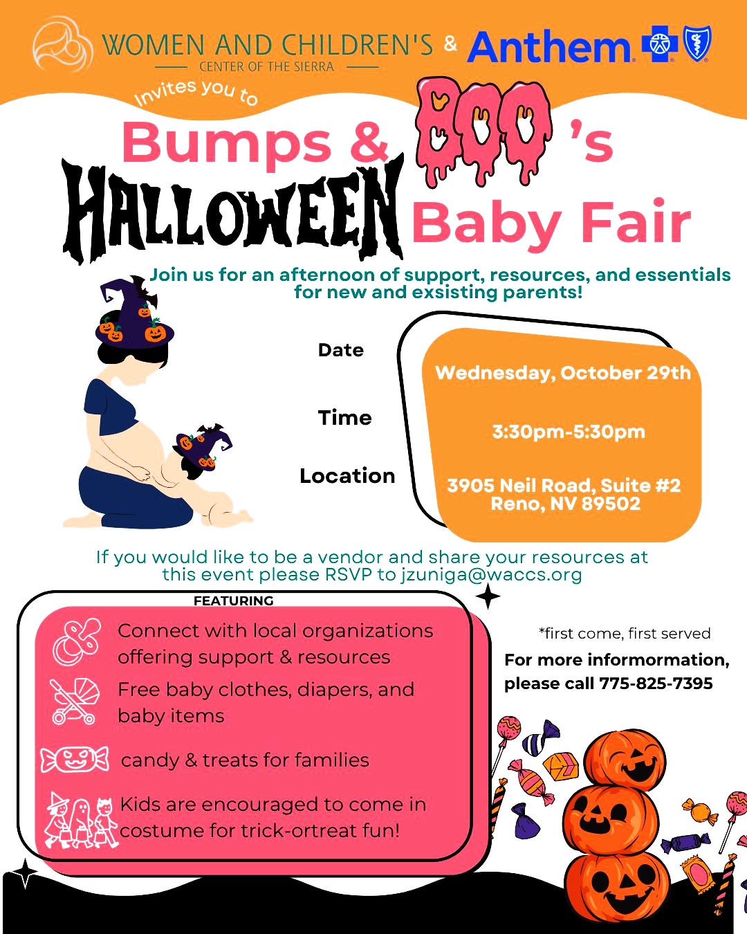 Join us next Wednesday, October 29th, from 3:30–5:30 PM at 3905 Neil Road, Suite #2, Reno for a family-friendly afternoon full of community resources, baby supplies, and Halloween fun!