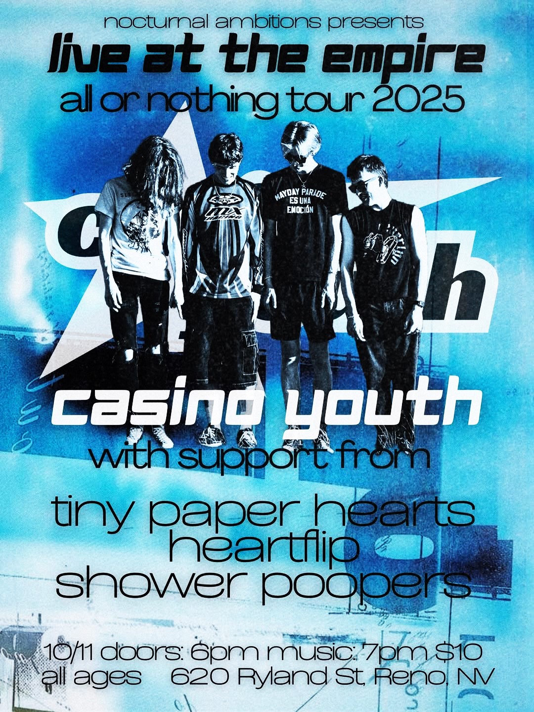 Casino Youth is a high-energy band hailing from Berkeley, delivering fast, catchy, and emotionally raw pop punk anthems. With driving guitars, punchy drums, and lyrics that hit like teenage heartbreak, they channel the spirit of early 2000s punk with a fresh, Gen Z twist. Whether on stage or in the studio, Casino Youth brings pure DIY passion and Bay Area attitude to every song. đź’«
