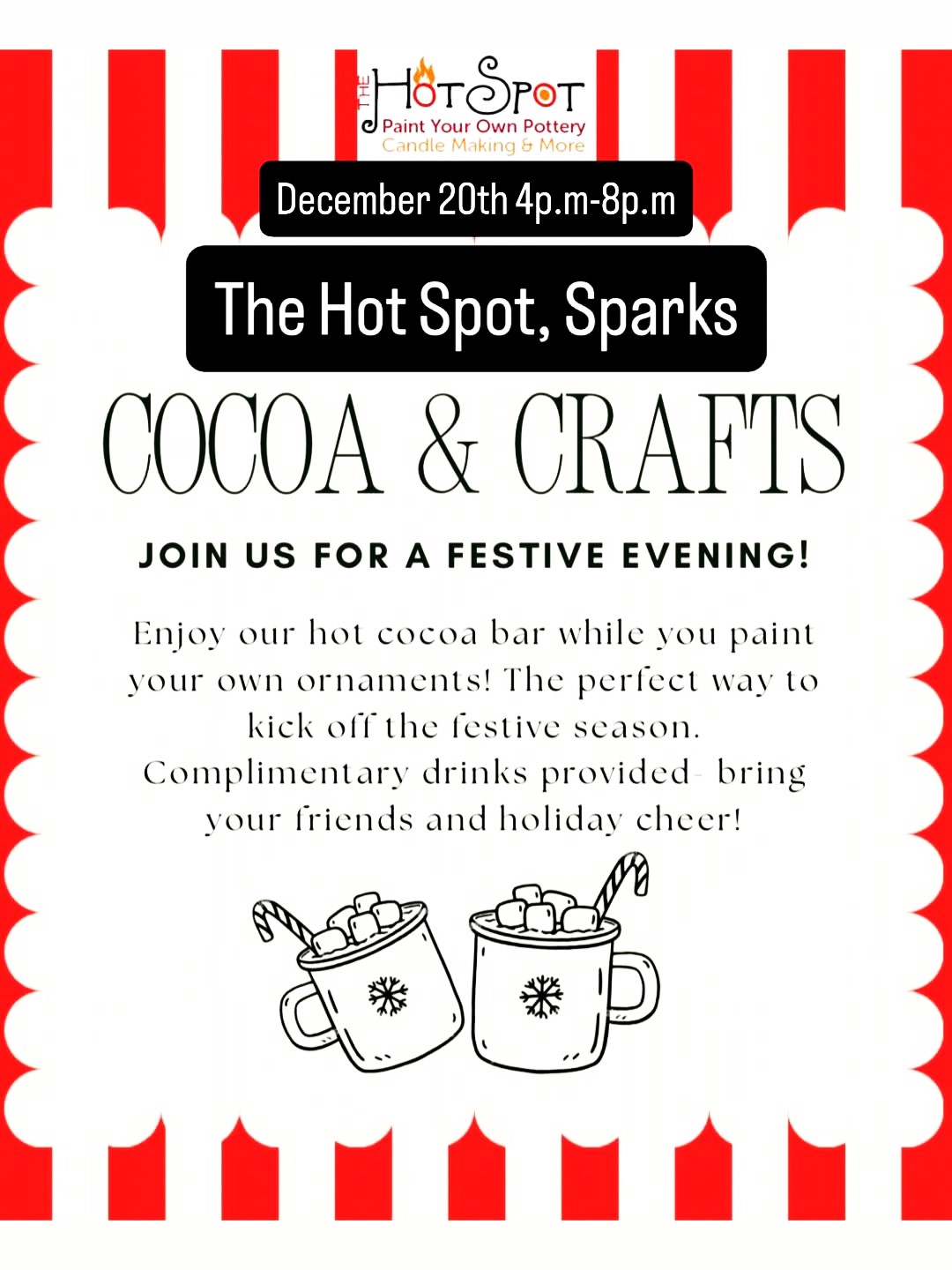 Come join us on December 20th!! Our staff here at The Hot Spot Reno, Sparks will be hosting a hot cocoa night to pull the winners’ for our Toys for Tots Donation Raffle and to share the joy by passing out cookies, cider, and cocoa to those who are doing projects in the studio from 4p.m-8p.m.