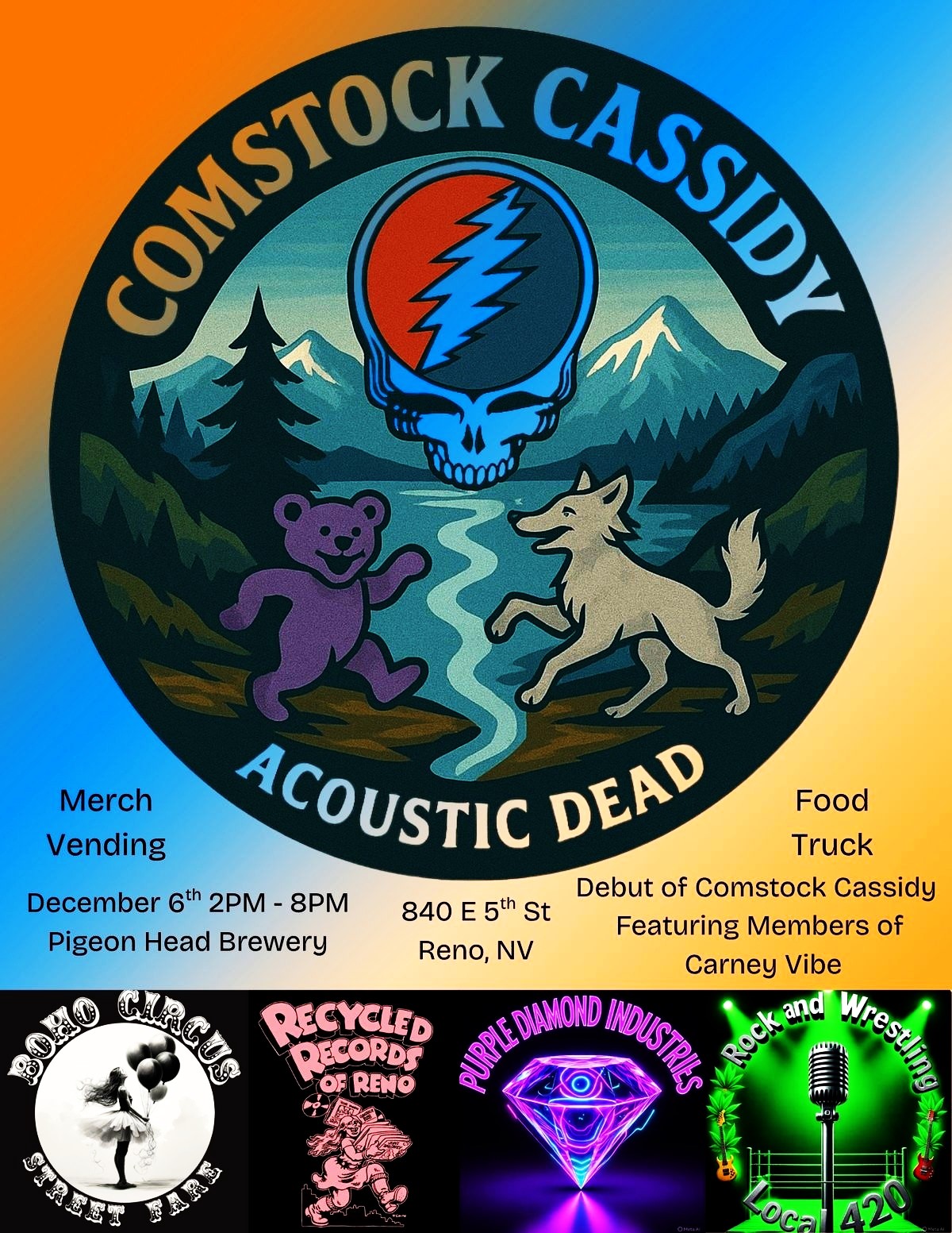 Come on down and celebrate PigeonDead with the debut of Comstock Cassidy featuring members of A Carny Vibe. We’ll have a food truck and merch vending from Cosmic Chris, Recycled Records.