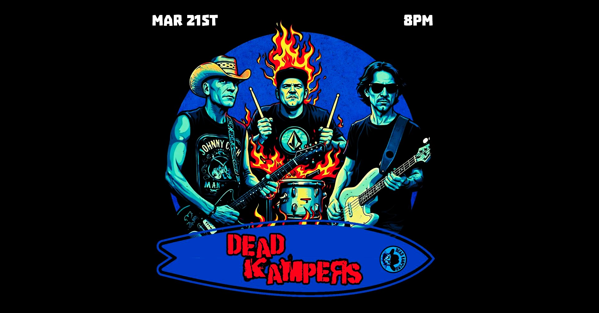 On Saturday, March 21st, the Dead Kampers come crashing ashore at Pele Utu like a busted longboard in a storm swell. Surf, punk, garage rock, and just enough bad influence to make your mother nervous—served loud, fast, and unapologetic.