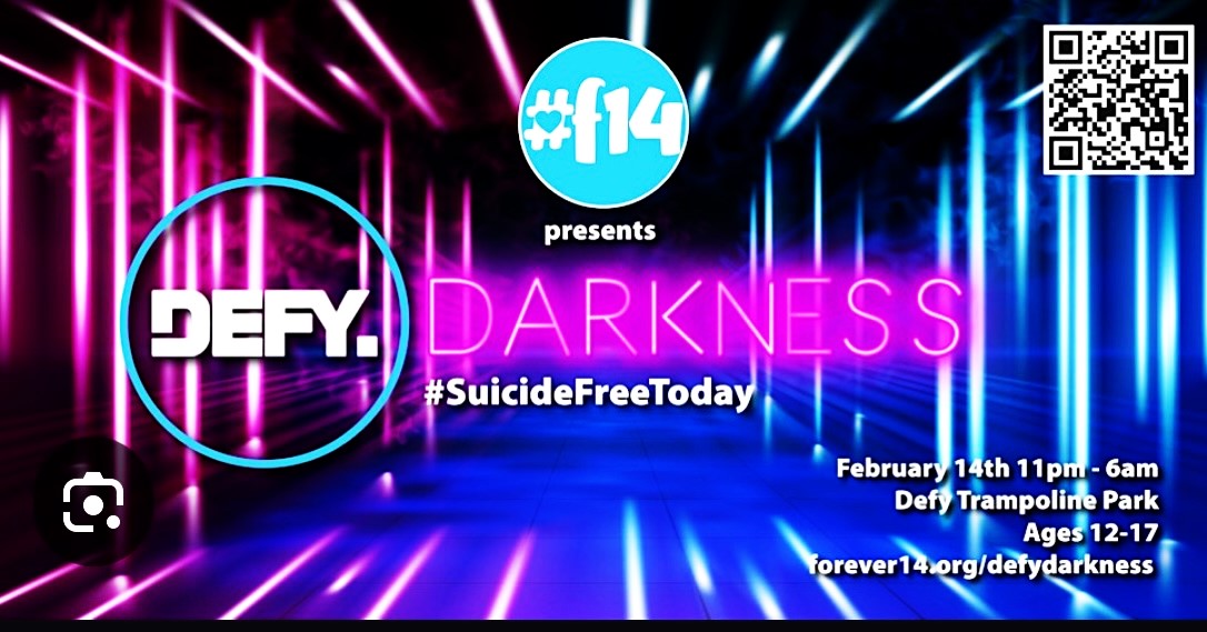 Forever14.org is once again taking over Defy Sparks, transforming this trampoline experience into a giant sleepover for 100 teens. Our lock-in starts at 11 pm and lasts all night till 6 am when we all walk out of the dark, shining our light. There will be an optional 3-Cay walk around the Marina to remember those who died by suicide and to commit to being #SuicideFreeToday. Parents and supporters are welcome and encouraged to join us on the Sunrise walk.
