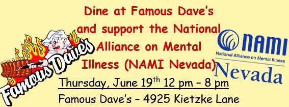 Dine at Famous Dave’s (4925 Kietzke Lane) on June 19th all day and support the National Alliance on Mental Illness (NAMI Nevada)!