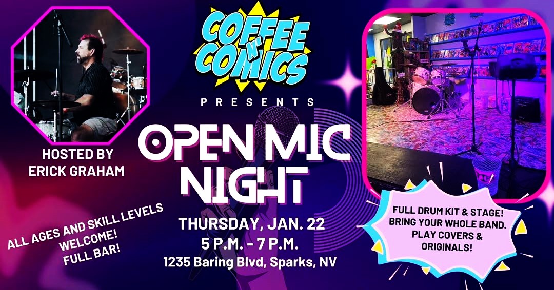 Erick Graham is a local musician and open-mic host in the Reno/Sparks area who leads community music nights at Coffee N’ Comics, welcoming performers and music lovers to share their talent.