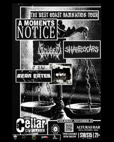 The Cellar Stage welcomes back once again, Sacramento's A Moments Notice.Washingtonians Gouged are taking their first trip down the ramp and it's all supported by local favorites Shared Scars.