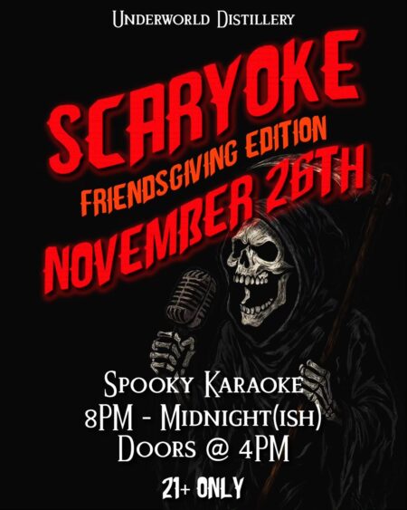 ng! Don’t you want to have some fun with great drinks while you sing your heart out before you have to (or want to) spend all day with your family for Thanksgiving? If so, then Underworld Distillery is the place for you! Doors @ 4PM, event begins @ 8PM and will go until midnight(ish). Come “pregame” with us! 21+ ONLY.And yes, you can wear a costume again if you’d like.