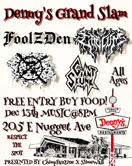 lessTHE DENNYS GRAND SLAM Dec 13th205 E Nugget Ave 7:30 Doors 8:00 Music ALL AGES FREE!!! BUY FOOD ITS A MIXED BILL SO U GET A LIL BIT OF EVERYTHING ON UR PLATE 🍽️🍳FOOLZDEN @fzd.blc CAELUM @caelum.nv DOING SOAD COVERS WITH🤝FZDGIANT SKUNK @giantskunk AxG @imjus_tamisfit We’re keeping this set short and sweet like a stack of pancakes🥞🍓🫐Hungry for more? order some pancakes for take out🥞it’s cold outside so make sure to pair em with a warm cup of hot chocolate ☕️ ORRR you can stay after the show and dine in for the Foolz Family Feast!!! We’re gonna be celebrating the show by having a big dinner together🍽️ if u order before, during, or after please let a hostess know you are there for the event RESPECT THE SPOT LAST SHOW OF THE YEAR LETS END IT WITH A GRAND SLAM