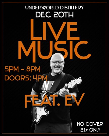 Live music is here at Underworld Distillery on December 20th from 5PM to 8PM! Listen to the music of Ev, and guitarist and vocalist that we are excited to have back! Relax. Have a drink. Stay awhile. 21+ only. No cover. Doors @ 4PM.