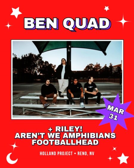 Now announcing the arrival of Ben Quad (@benquadok), an amalgamation of all the shit emo kids like: screaming, synths, pop sensibilities all mixed withcrazy emotional stuff, MARCH 31 😌 With support from Riley! (@rileytheband), Aren’t We Amphibians (@arentweamphibians), and Footballhead (@footballheadchi)… holy lineup