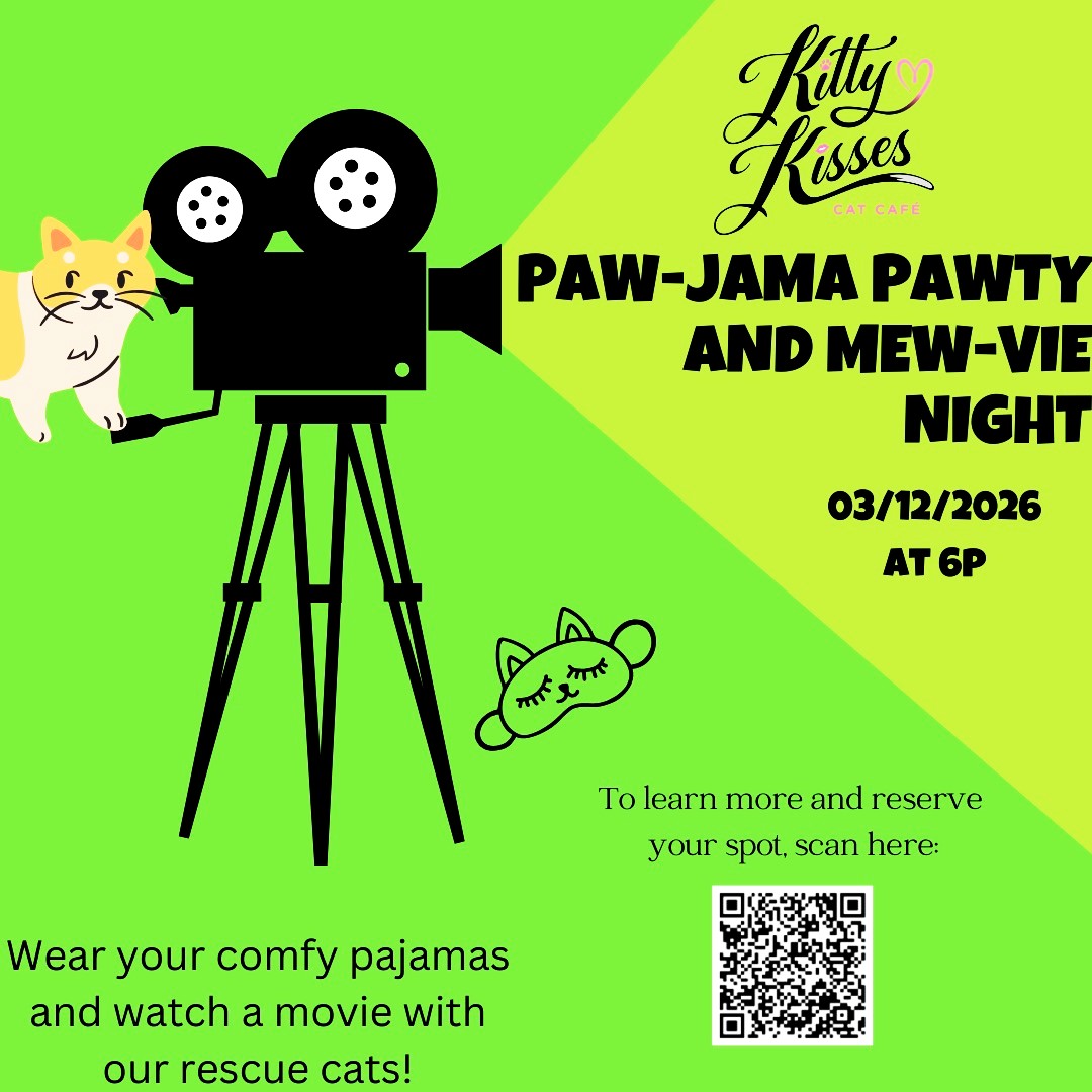 Wear your comfy pajamas and watch a movie with our rescue cats!