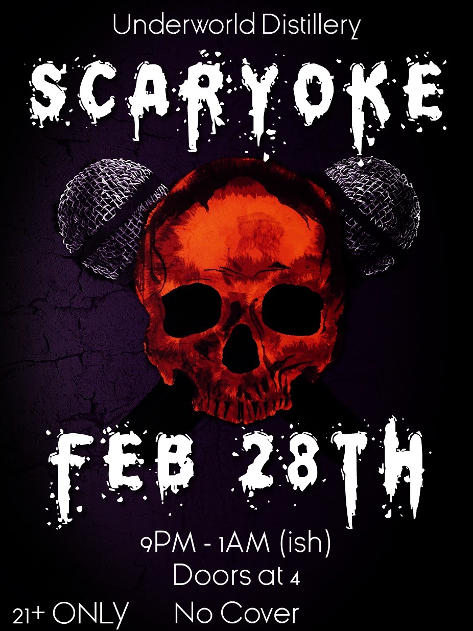 End the month right with Scaryoke (spooky karaoke) here at Underworld Distillery! Doors open at 4PM, but the party REALLY kicks off at 9PM! Bring a friend, family member, or just yourself! Jam out with us on February 28th.