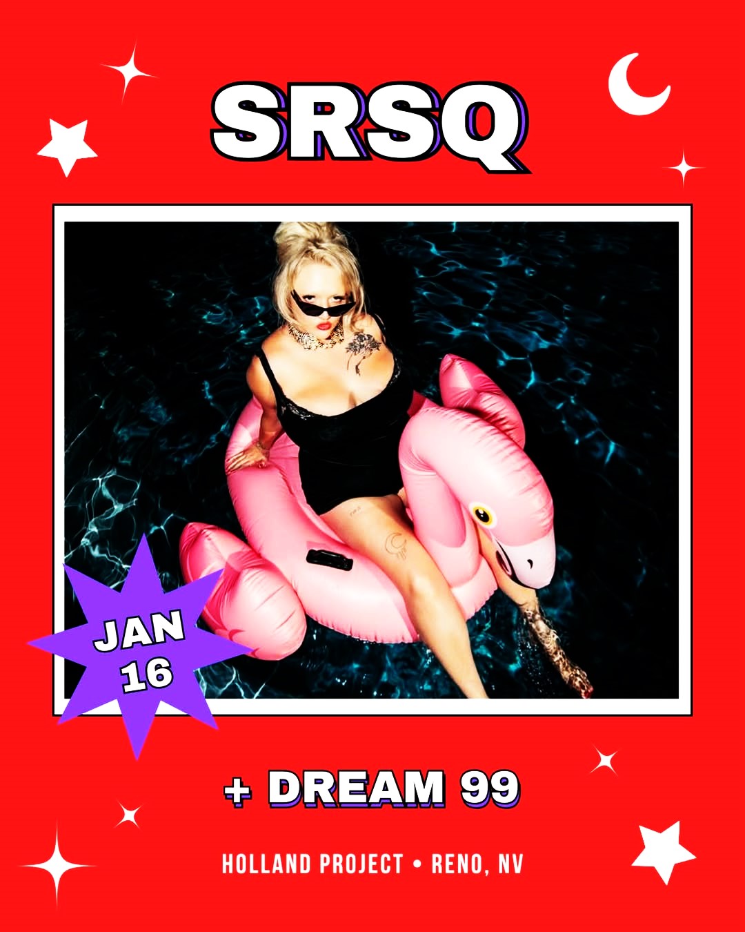 This just in!!! SRSQ (@srsqofficial) is back in Reno FRIDAY, JANUARY 16, with support from Dream 99 (@dream99_worldwide) 🥳 Tickets, to a night of swirly guitars and moodswinging songcraft, are on sale now at hollandreno.org 💟