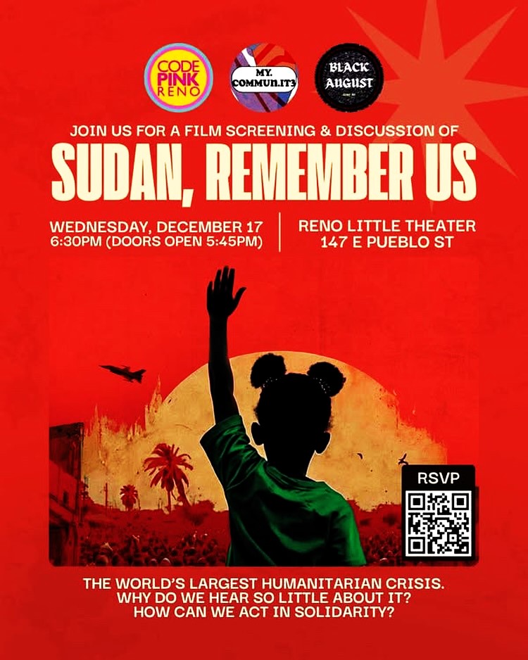“Join @codepinkreno @my.commun.it3 and @blackaugust.reno for their next film screening! Sudan is living through one of the world’s most devastating and underreported humanitarian crises – and yet so many people still don’t know what’s happening. Suda, Remember Us brings us face-to-face with the stories, the struggle, the resilience of families caught in a war they did not choose. We’ll watch together, reflect together and connect around what action looks like right here in our community. Everyone is welcome. Free admission, but donations appreciated. Link to tickets in bio!“ #thingstodoinreno