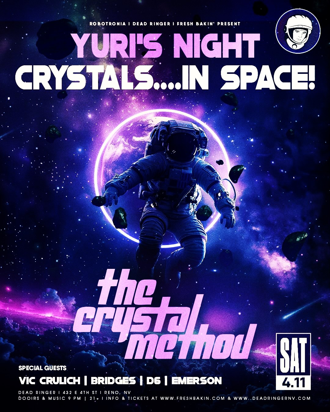 Yuri’s Night is an annual international celebration held every April 12 to commemorate the first human spaceflight by Yuri Gagarin in 1961 and the launch of the first Space Shuttle in 1981, blending space history with global community events. It’s known as the “World Space Party,” bringing people together with music, art, science, and education to inspire interest in space exploration and unity across cultures. The Crystal Method returns to the Dead Ringer solar system 🧑🚀