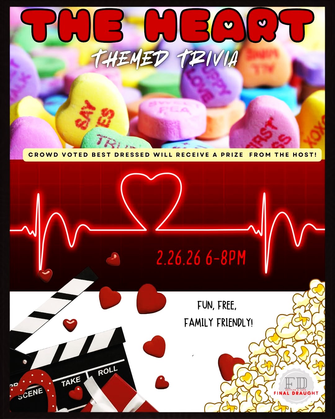 February’s themed trivia 💡 Get ready for a night full of heart at Final Draught. Join us for The Heart Themed Trivia on February 26 from 6 to 8 PM, where the theme is all things heart, from the beating kind to love stories and everything in between. ❤️🍬