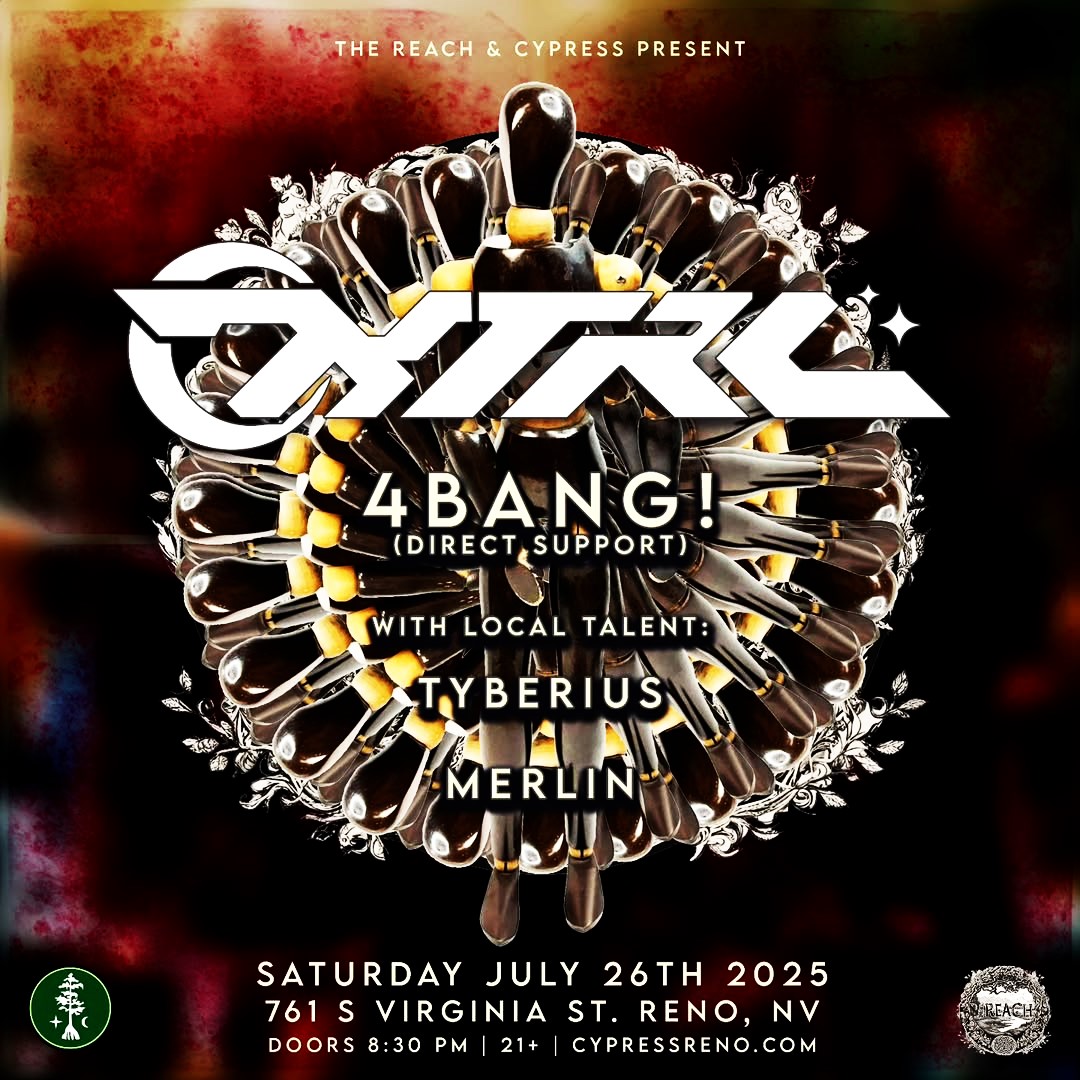July 26th, get ready to turn up the energy, feel the bass, and lose yourself in the sound. The lights are low, the vibe is high, and behind the decks, all the way from Chicago, let’s welcome KTRL for his Reno, Nevada debut show! KTRL – an Aphotic producer/DJ of bass-driven electronic music laced with echoes of old-school hip-hop, dub, and house. A darker era unfolds—new sounds, new visions. With direct support, we have our very own 4BANG! , joined by local support TYBERIUS and MERLIN , presenting his “ReKursed Project”.
