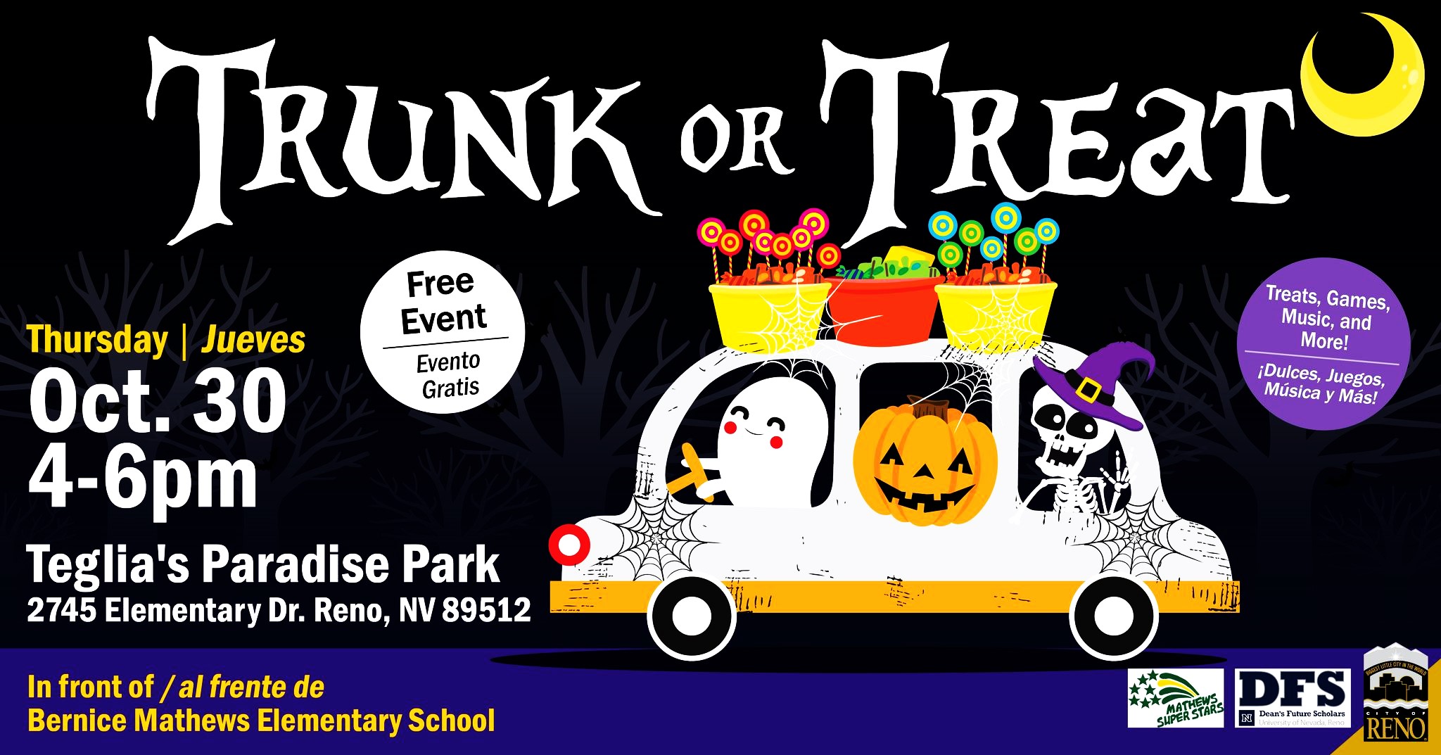 Let the “ghoul” times roll as the City of Reno, in partnership with Dean’s Future Scholars at the University of Nevada, Reno, and Bernice Mathews Elementary School, presents the fourth annual Trunk or Treat on Thursday, October 30 from 4 p.m. to 6 p.m. at Teglia’s Paradise Park in front of Bernice Mathews Elementary School!