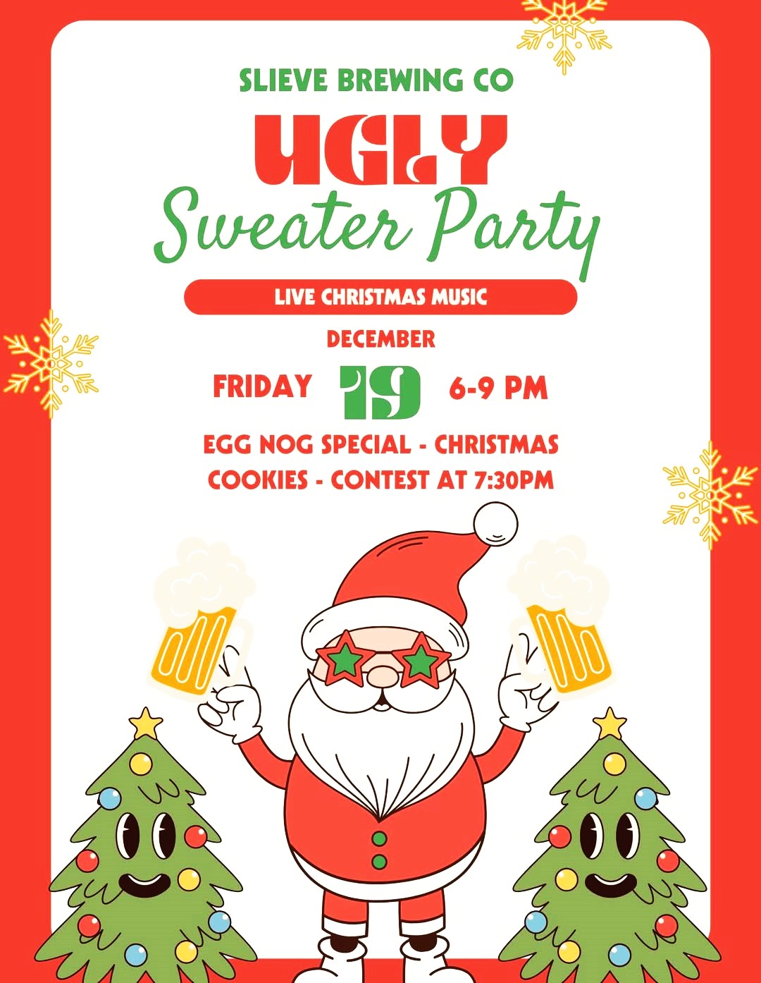 Judging for the Ugly Sweater contest will begin at 7:30pm.