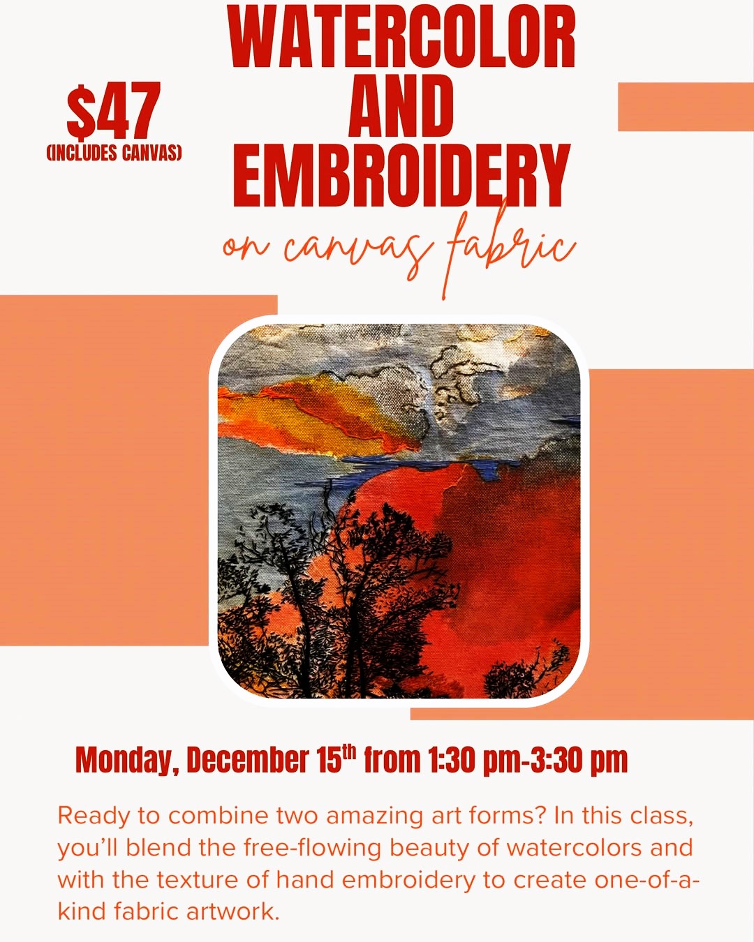 In this class, you will blend the free flowing beauty of watercolors and with the texture of hand embroidery to create one-of-a- kind fabric artwork.