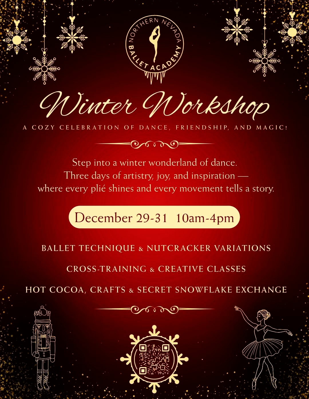 Join us December 29–31 for three magical days of dancing, creativity, and winter-themed fun. We offer workshops for two age groups: 3–6 and 7–18. Each day includes ballet, variations, strength and conditioning, hip hop, musical theatre, seasonal crafts, Nutcracker-inspired activities, and a mini performance.