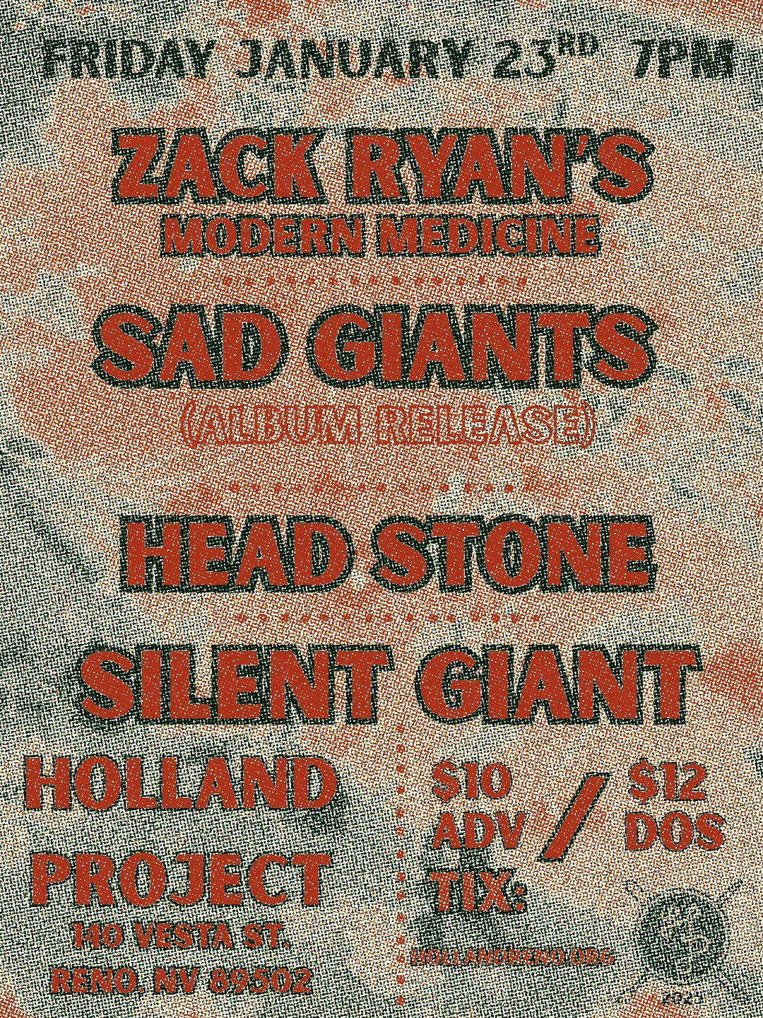 All local showcase with Silent Giant, Sad Giants (Album Release!), Zack Ryans Modern Medicine, and Head Stone.