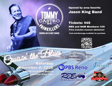 Event Details:• Date: Saturday November 8• Doors Opens: 5:30 PM• OPENER-Jason King Band: 6:30 PM• HEADLINER- Tommy Castro and the Painkillers: 7:30 PM• General Admission: $45per person• Member Admission: $35 per person, call 775.333.9300 for discount code