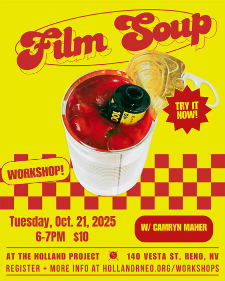 Participants will need to bring their own previously shot rolls of 35mm film (cheap color film works best), and we will provide all the ingredients for mixing up your own unique film soup concoctions. We will also have film available for purchase at the workshop in case you want to experiment with more film souping at home.